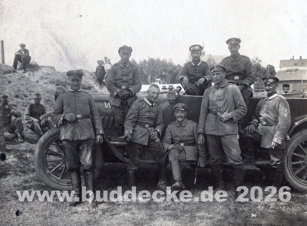An der Ostfront im Kriegsjahr 1915. Kraftfahrer und Monteure machen dieses Erinnerungsfoto vor einem Kraftfahrzeug der FFA 31.